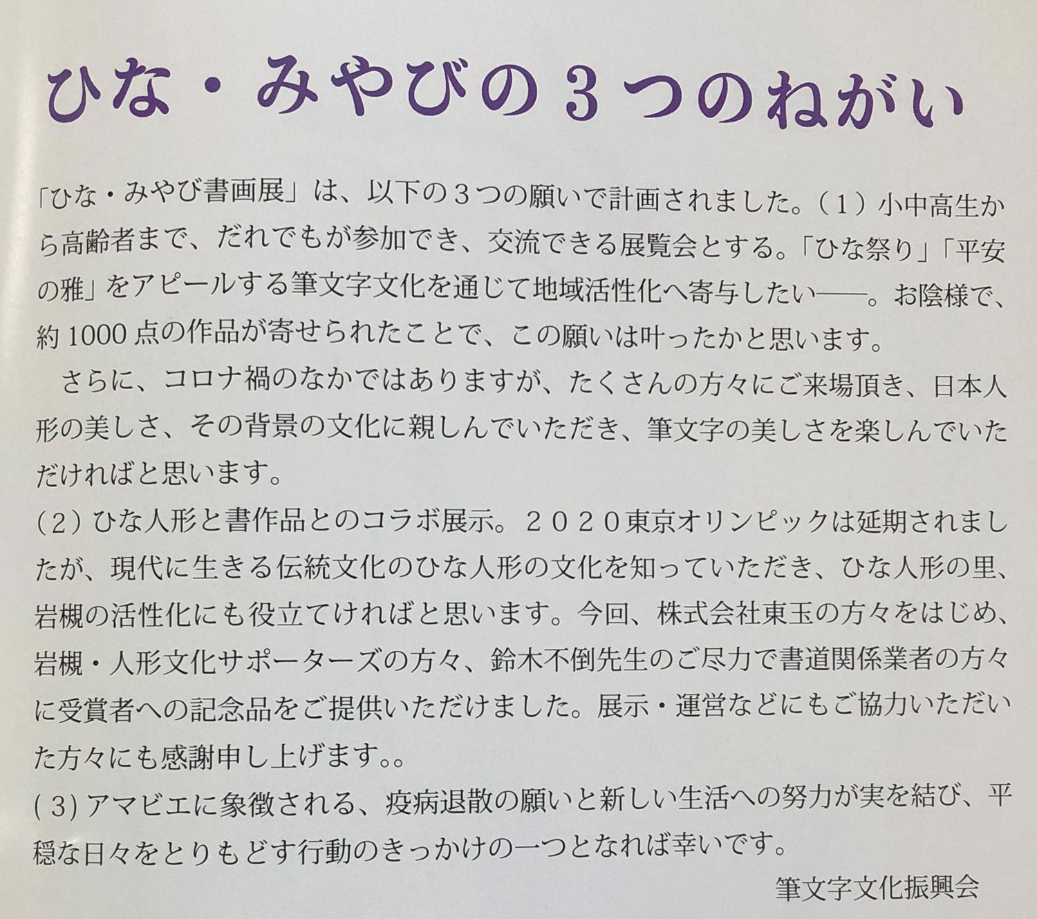 11月1日(日)~8日(日)まで、筆文字文化振興会様が「ひな・みやび書画展」と題して、岩槻・東玉総本店3Fの特設会場で展示会を開催してくださっています。