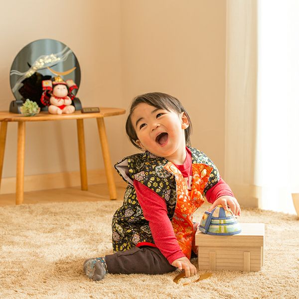 端午の節句のお祝いに着れる1才用(フリーサイズ)の陣羽織です。着ない時は立て掛ける台もあるのでお飾りとしても。ハチマキも付いています。