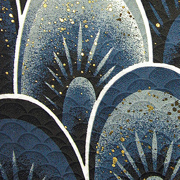 ポリエステル素材に波柄を織り込んだジャガード織りに、伝統の捺染技法によるぼかし染めをし、豪華絢爛なアルミ金箔をちりばめて仕上げました。