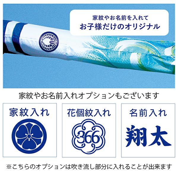 オプションで吹き流し部分に家紋や名前をお入れ出来ます。ご希望の方は鯉のぼりをカートに入れた上こちらをクリックしてご覧ください。