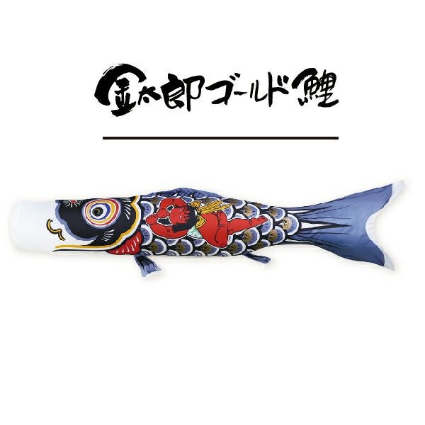 たくましい金太郎と、黄金鶴柄が金粉で描かれた金太郎ゴールド鯉。吹流しには魔除けの意味をもつ五色を用いた五色吹流しをセットしています。