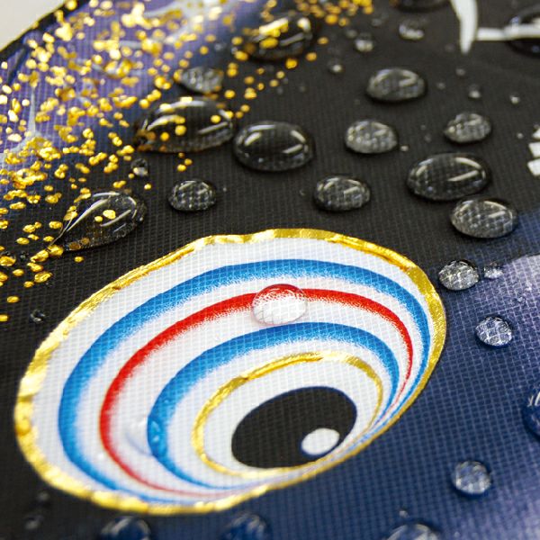 千寿は立体交差織のポリエステルを使用し、太陽光を浴びると白銀色に輝く特殊加工が施されています。吹き流しには繊細な線で描かれた波柄を青系の色づかいで構成し、落ち着いたデザインが鯉のぼりを引き立てます。