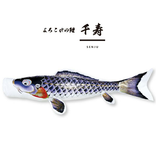千寿は立体交差織のポリエステルを使用し、太陽光を浴びると白銀色に輝く特殊加工が施されています。吹き流しには繊細な線で描かれた波柄を青系の色づかいで構成し、落ち着いたデザインが鯉のぼりを引き立てます。