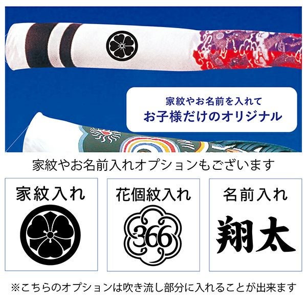 オプションで吹き流し部分に家紋や名前をお入れ出来ます。ご希望の方は鯉のぼりをカートに入れた上こちらをクリックしてご覧ください。