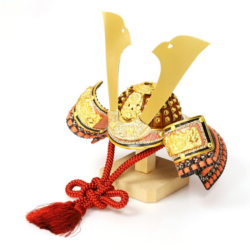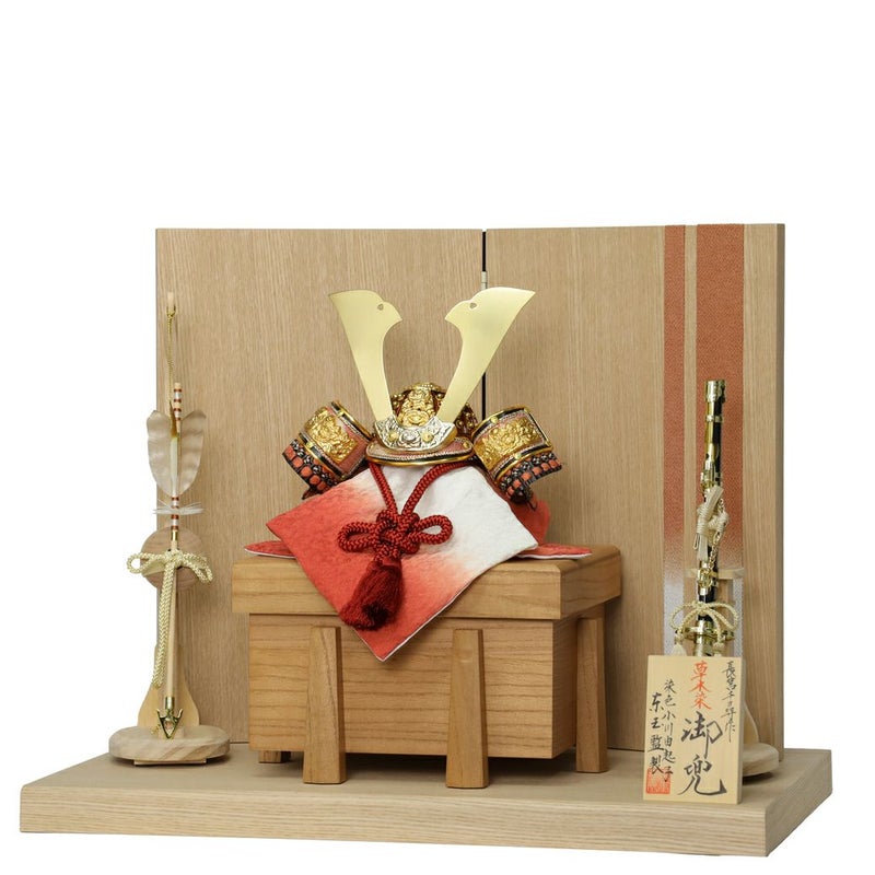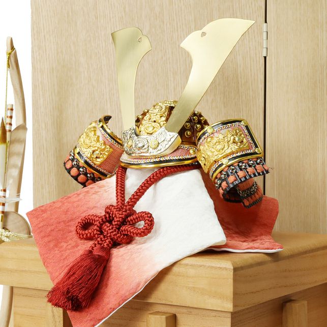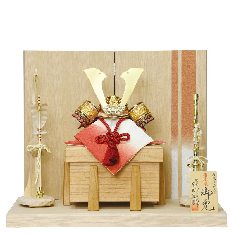 草木染の正絹を朱赤に染めた兜に、吹き返しの龍村裂や手打ち星鋲を施し、和洋どちらにも合う上質な飾り。屏風にも草木染裂でラインを入れナチュラルに美しく仕上げました。