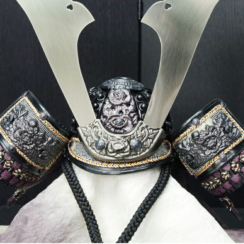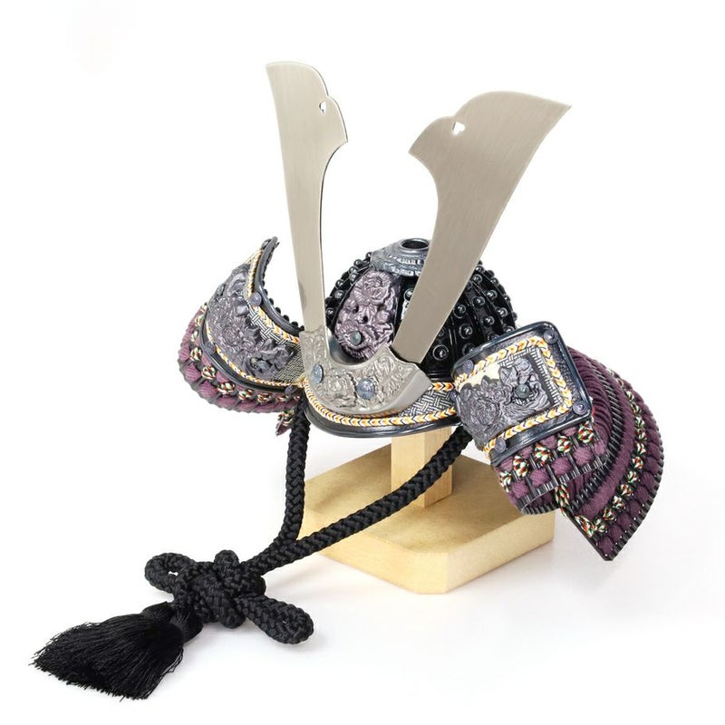 ブロンズの兜に草木染の藤色縅糸と袱紗が映える、お洒落な逸品。吹き返しには京都・龍村美術織物を用い、上質な品格を添えました。