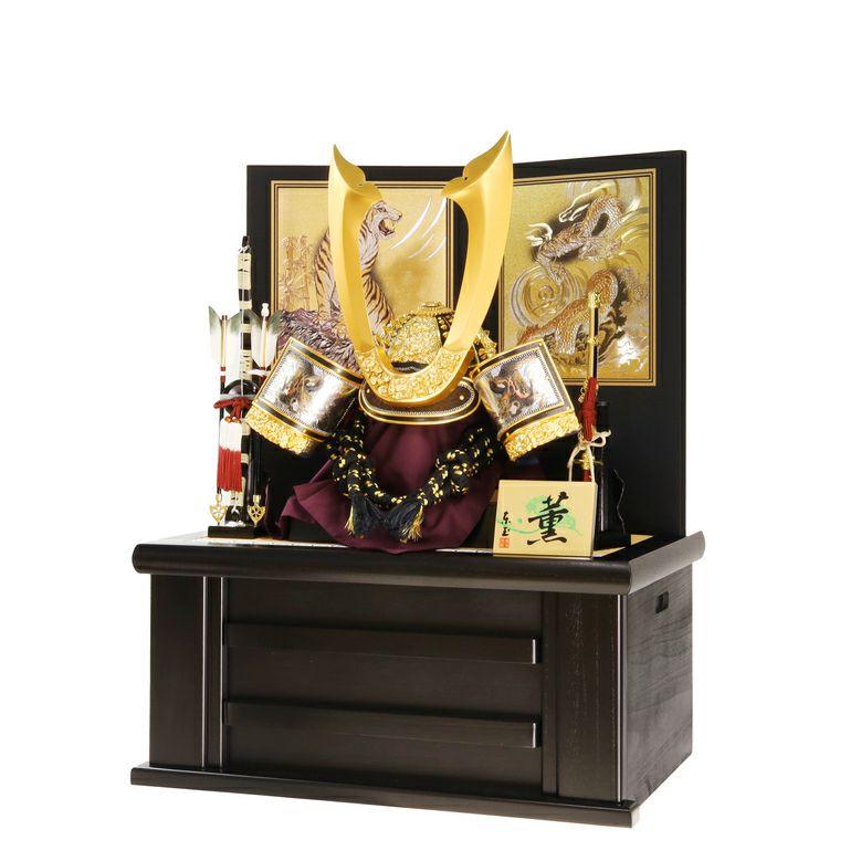 龍虎屏風と吹き返しの龍彫金が高級感を演出する着用兜収納飾り。大きくなったお子さまが実際にかぶって記念写真を撮れる楽しみも備えた特別な兜飾りです。