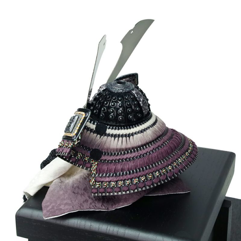 ブロンズの兜に草木染の藤色縅糸と袱紗が映える、お洒落な逸品。吹き返しには京都・龍村美術織物を用い、上質な品格を添えました。
