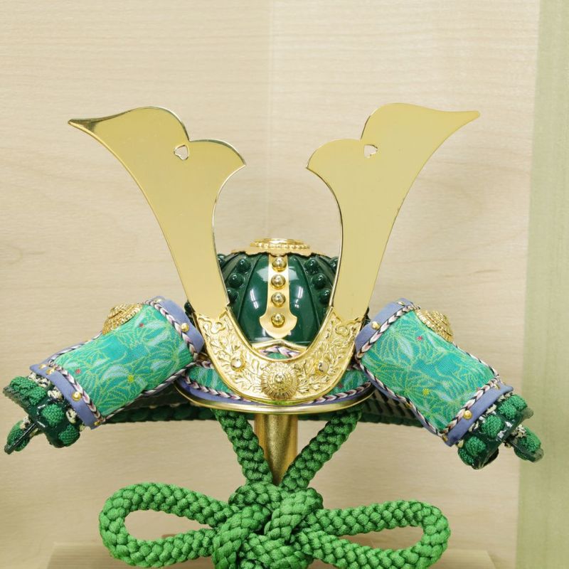 力強く根を張る樹のように育ってほしいという願いを込めた兜。緑の鉢と小札のシンプルな構成に、龍村裂の吹き返しが気品を添え、自然の生命力と格調高い美しさを表現した逸品です。