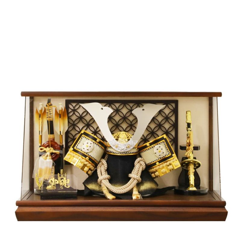 前面斜めカットのアクリルケース入り兜飾りです。木目調でインテリアに馴染み、背景の七宝の細工も縁起の良さを演出します。割れにくく安心して飾れます。
