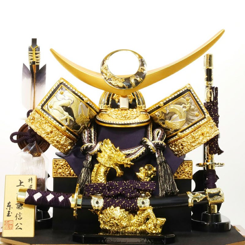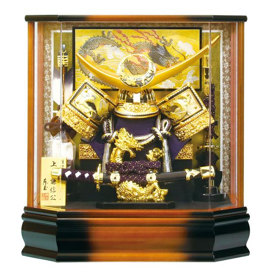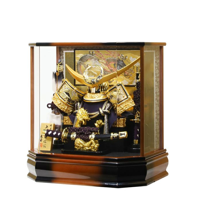 長寿を願う六角形の亀甲型ケースに、色のコントラストが上品な雰囲気を演出。太刀・吹き返し・台座に施された龍の装飾が、立身出世の願いを込めた兜ケース飾りです。