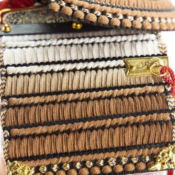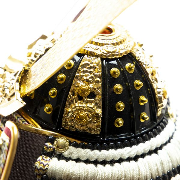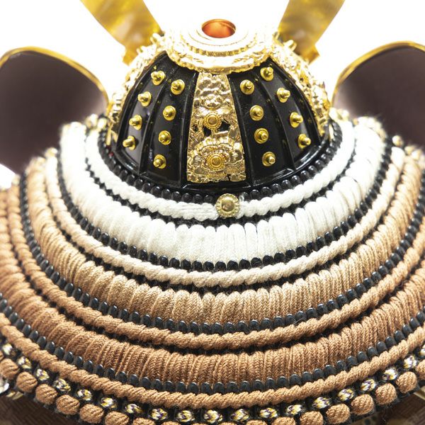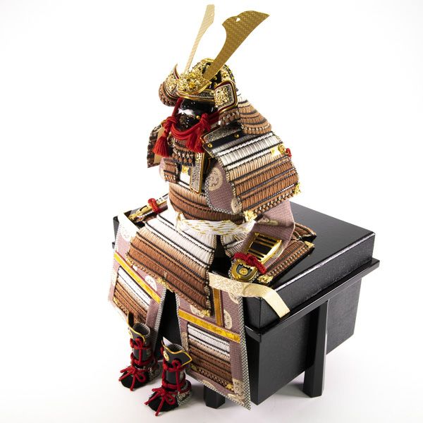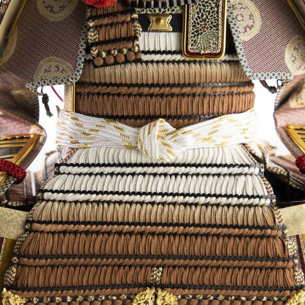 生命力を感じさせる茶色に草木染で染め上げた凛々しい鎧です。裂地の部分には京都の龍村美術織物「糸屋輪宝手紫」が使われ、優雅で品格のある仕上がりとなっています。屏風は手描きで白梅の絵が描かれており、とても優しい雰囲気のある飾りです。