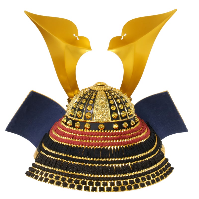立体の鍬形が、勇ましさを演出しています。吹き返し部分には、龍の彫金が施されており高級感があります。屏風は兜に合う太陽のデザインで制作しました。