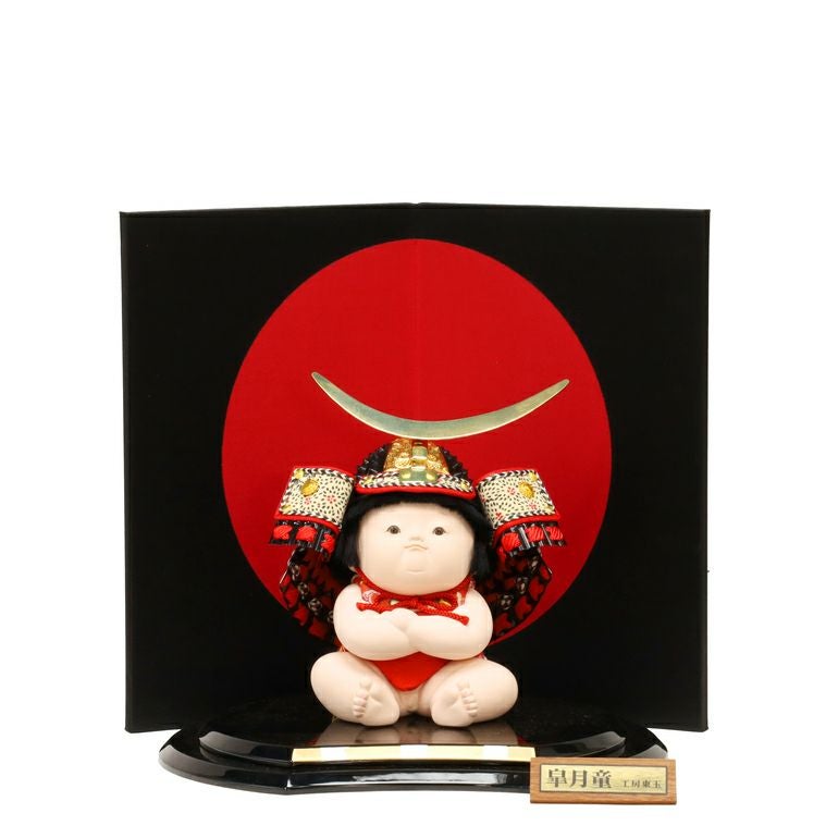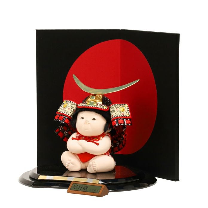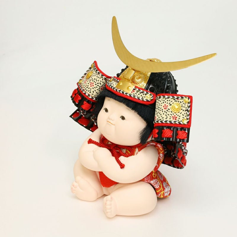 可愛いけれど堂々とした男児「陸」。きりっと結んだ口元ともちもちのボディーに生まれたての生命力が宿る木目込童人形。大地のように堂々とした男子に成長されるよう、金太郎のような強さへの願いを込めて。