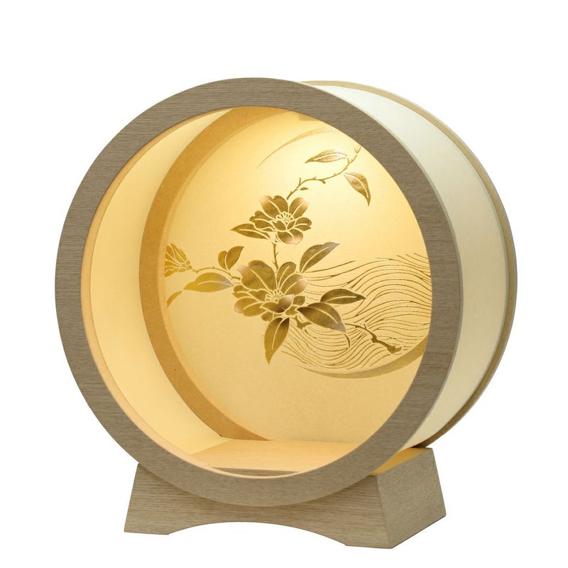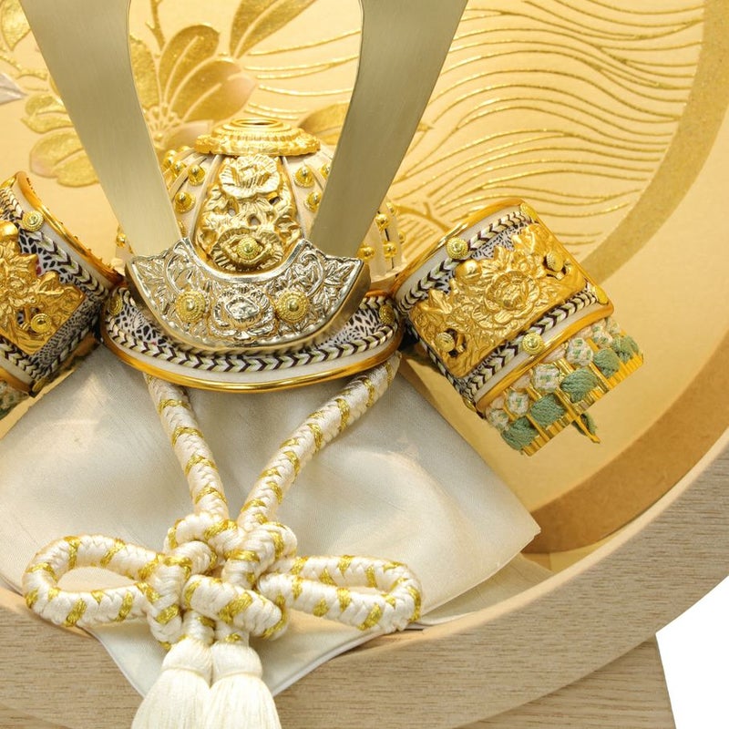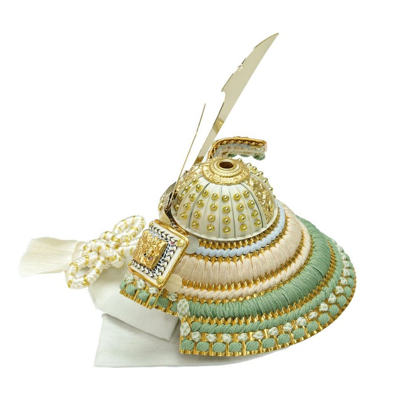 パステルカラーの鉢と縅糸を使用した、コンパクトな兜飾りです。丸型の白木台にはLEDを使用しています。可愛らしさと高級感あふれるおしゃれな兜飾りです。