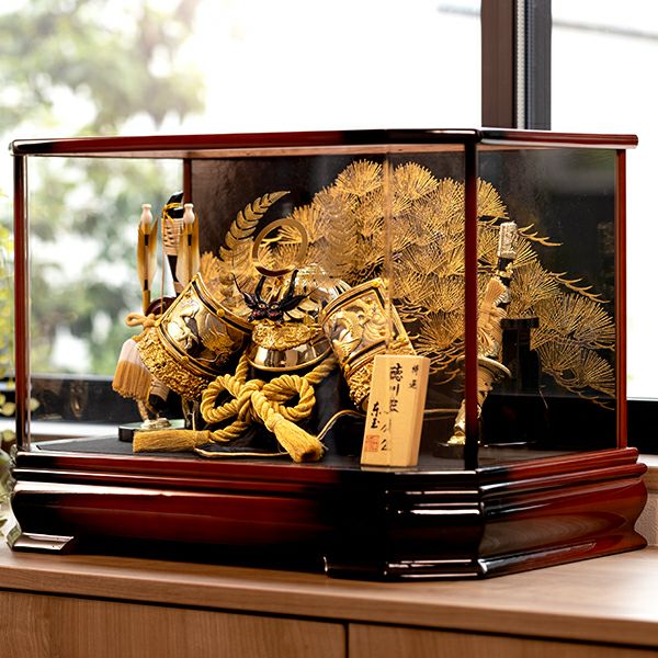 天下泰平の世を築いた徳川家康は駿河から関東、茨城、栃木と広い地域で人気があります。六角形ケースの前面にアクリル板を使用して、本来必要な枠が2本取れて兜がスッキリと見えます。