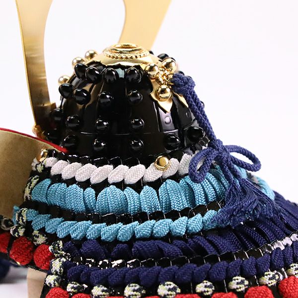 一般的には黒が多い兜鉢・小札板にも複数の色を施し、全体の一体感を演出しています。