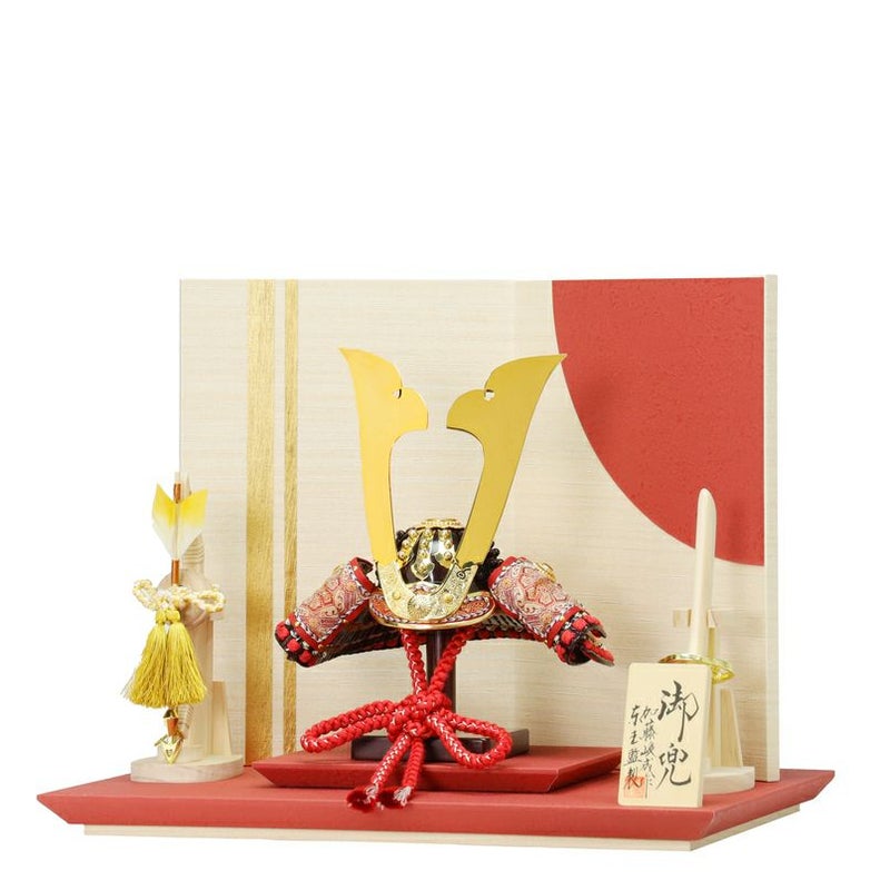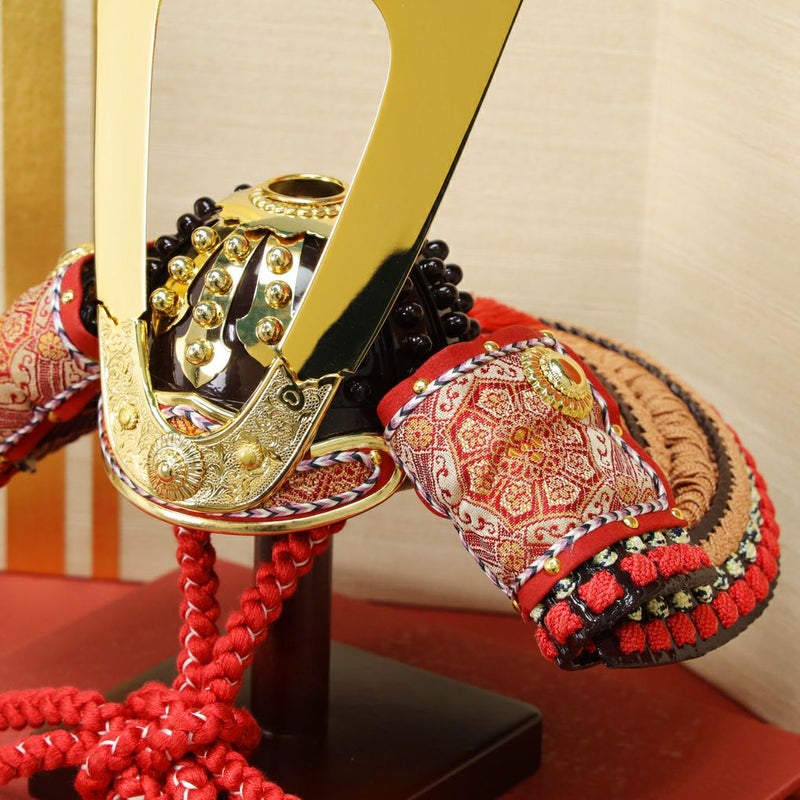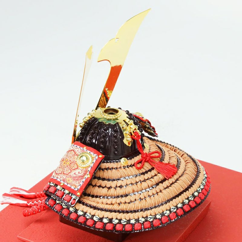 重厚感ある茶塗の兜に龍村裂を配した品格ある「大地」。大地に根を張るようにたくましく、どっしりとした強い心を持つ子への願いを込めました。