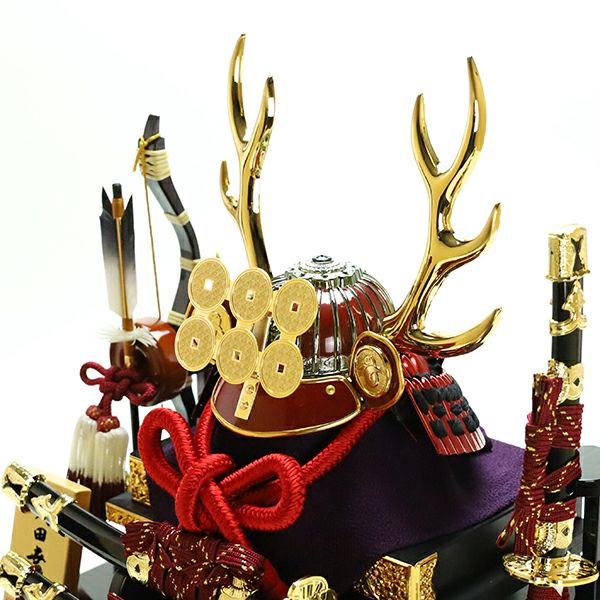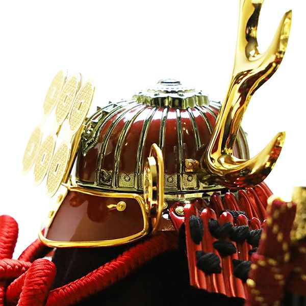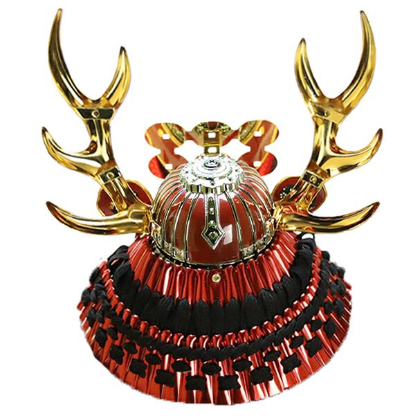 前面アクリルの六角赤暈しケースは真田幸村公をイメージして製作しました。バックには龍の彫金と十文字槍のセットをつけ、また兜の前には身を守るための大小の太刀が飾られ、勇猛果敢な武将を彷彿とさせるお飾りです。