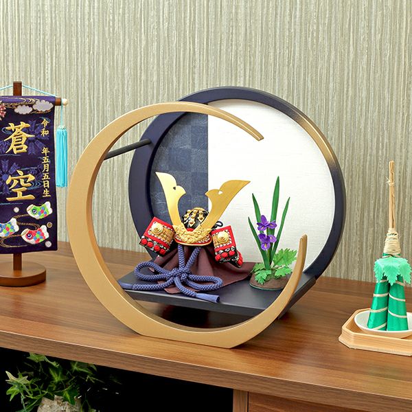 コンパクトながら高度な技術を要する「手並べ小札」を使用した本格的な兜となっています。飾り台は出窓や玄関にも飾れるコンパクトサイズで、兜の横にワンポイントの菖蒲のお花を飾ることで、和装インテリアの雰囲気を強調しました。