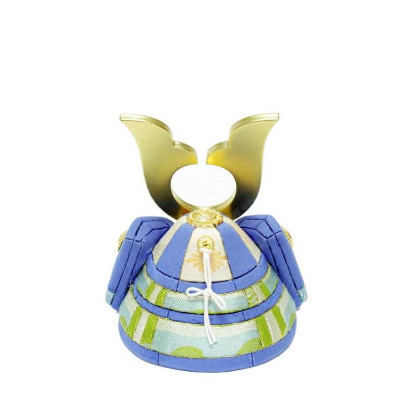 青と白の爽やかな男の子らしい配色が人気の兜飾りです。布地は正絹にこだわり、鍬形(角の部分)や金具は純金箔押しの伝統技法で仕上げています。立派な長い鍬形も特徴です。兜を飾る櫃(収納する箱)は桐材を使用。屏風の可愛らしい藤の花は五月の季節を演出します。