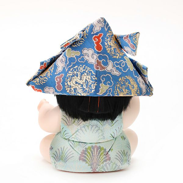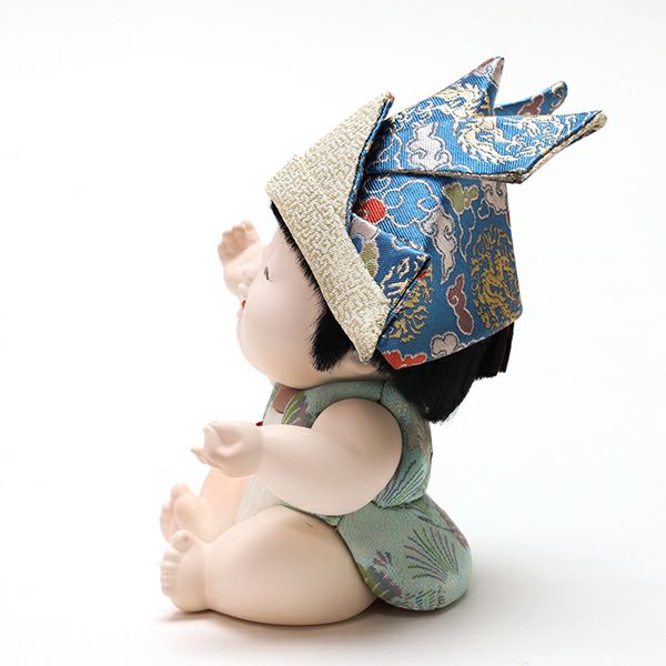 両手を上げて空を見つめる、笑顔が可愛い皐月童「翔(しょう)」。幼子の「動」の瞬間を切り取ったこだわりの東玉工房オリジナルの造形です。天翔る幼子をイメージし「翔」と命名しました。西陣織の兜が付きます。