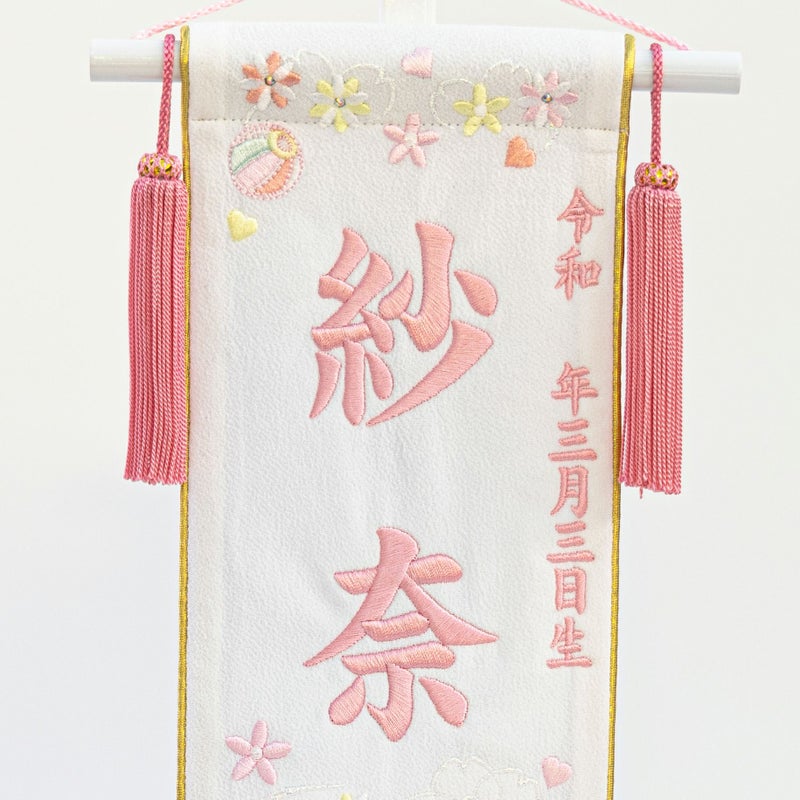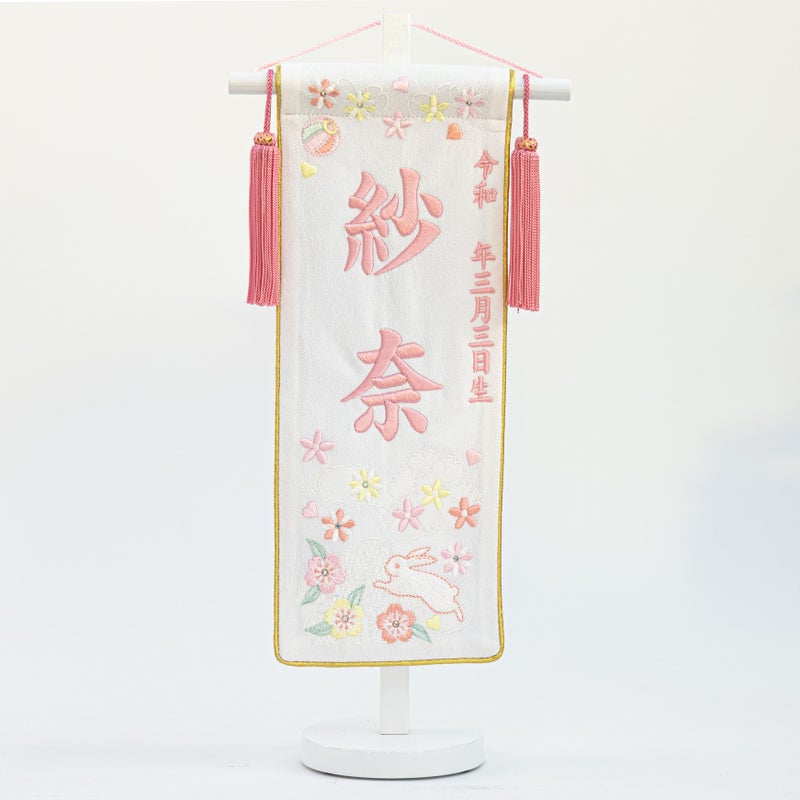 生年月日と名前の入る刺繍入りの名前旗です。鞠と桜,うさぎが可愛さを演出しています。 ※こちらの名前旗は出来次第の発送となり、お届けの希望日はお受けできません。(約2~3週間) ※商品購入ページの備考欄に生年月日と名前を入力してください。 ※令和元年生まれの場合は一年ではなく元年となります。※2026/2/23迄のご注文で3/3のお届けが間に合います。