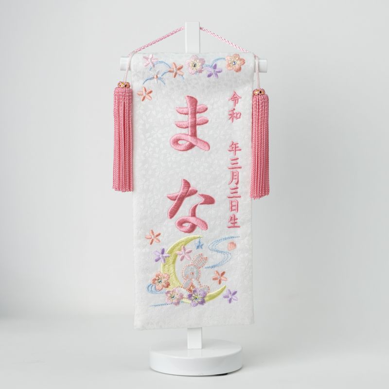 ひな名前旗 ホワイト月うさピンク刺繍R