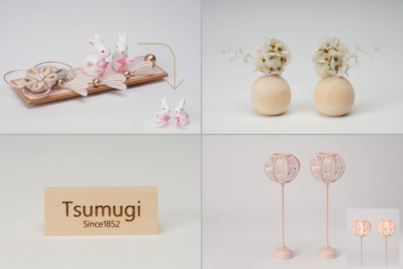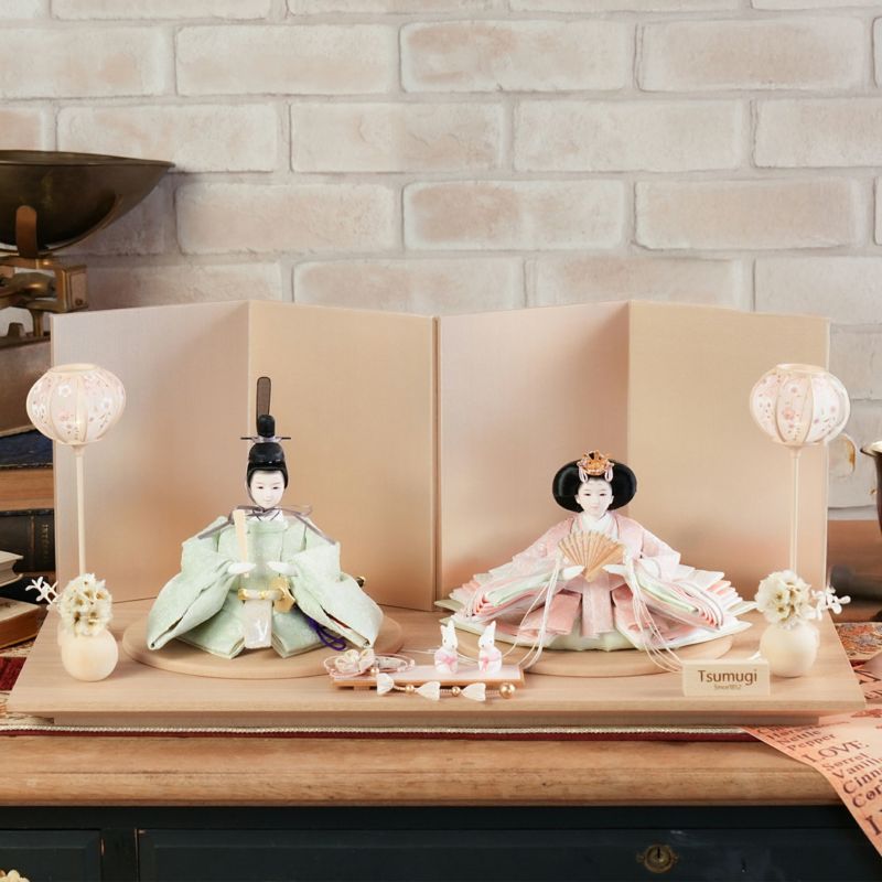 つむぎシリーズはお人形の顔が現代的でどれも美しく、その中でもこの「芽」はやさしげな春色のお着物とうさぎの前飾りが気に入り、選びました。