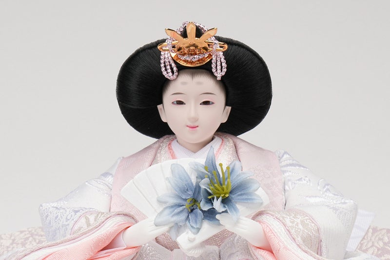 つむぎにのみ使用されるお顔が、高級感ある吉祥文様の着物に優しくなじみます。 「結(ゆい)」はブーケや扇にブルーのお花を添えることで、優しくも凛としたお飾り。