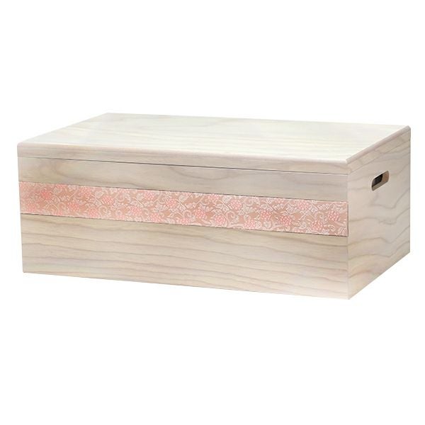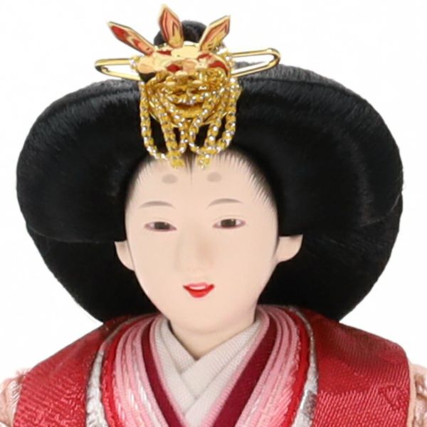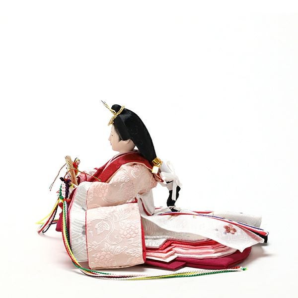 淡くやさしい色合いの人形の衣裳は正絹ならではの光沢感があり、人形師・池谷芳明による優美な仕立てに良く合います。白木の収納箱と屏風にはお姫様の衣裳と同じピンク色の正絹生地を貼り付け、モダンなおひなさまに仕上がりました。