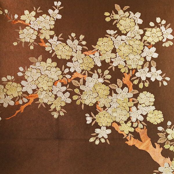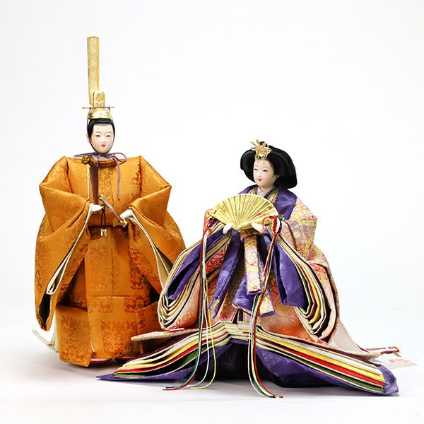 女流作家東之華による「黄櫨染」の立雛飾り。伝統的な衣裳に柄や古来より縁起が良いとされる五色を重ねに使用しておりますが、仕立てや色使いに東之華の世界が垣間見えます。
