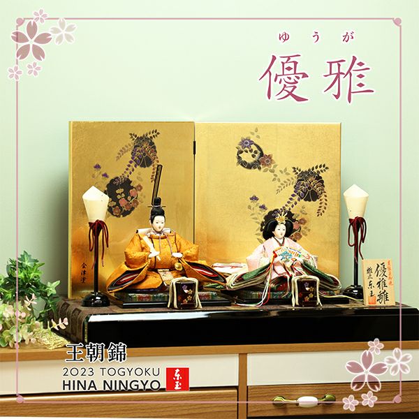雛人形の良き伝統を意識して製作した優雅シリーズの高級品です。男雛で使用した有職衣裳「黄櫨染(こうろぜん)」は、歴代の天皇陛下が即位などの重要儀式の際にお召しになる格式No.1の衣装です。令和新時代にご誕生のお嬢様に相応しいお雛さまです。