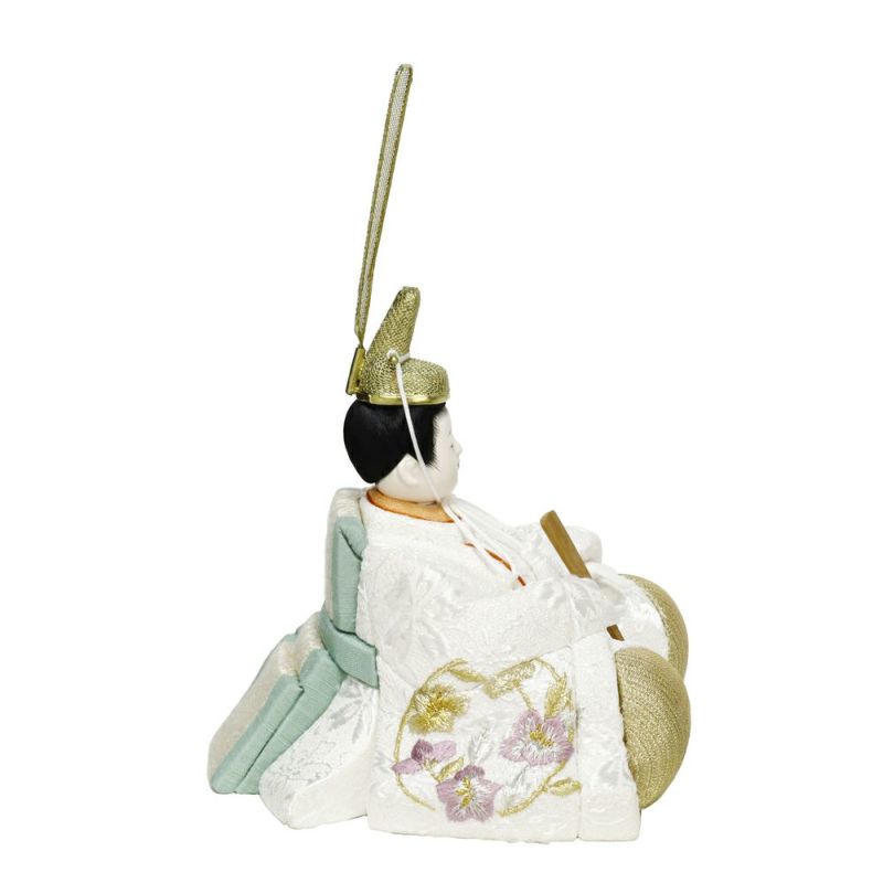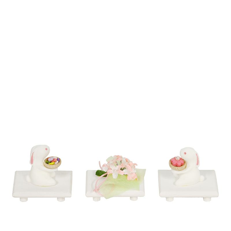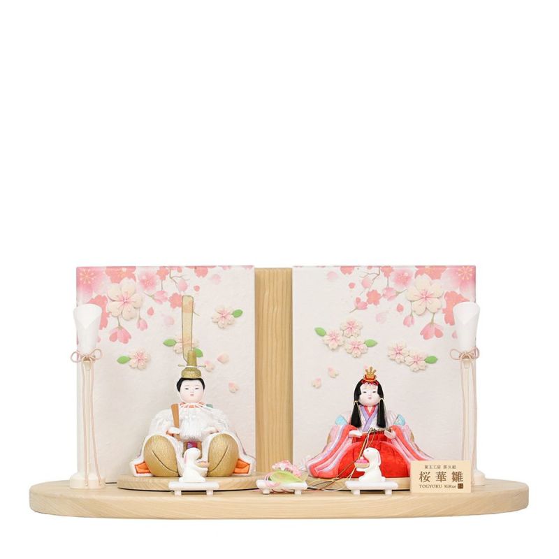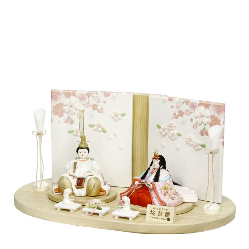 パール調の衣裳は春の日差しを浴びるとキラキラと輝き、お祝いの席に華やかさを添えます。背景を彩る屏風のデザインには所どころ立体感ある桜の花がデコレーションされています。縁起の良い可愛いうさぎのお飾りもついています。