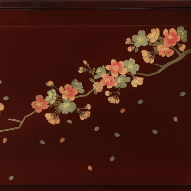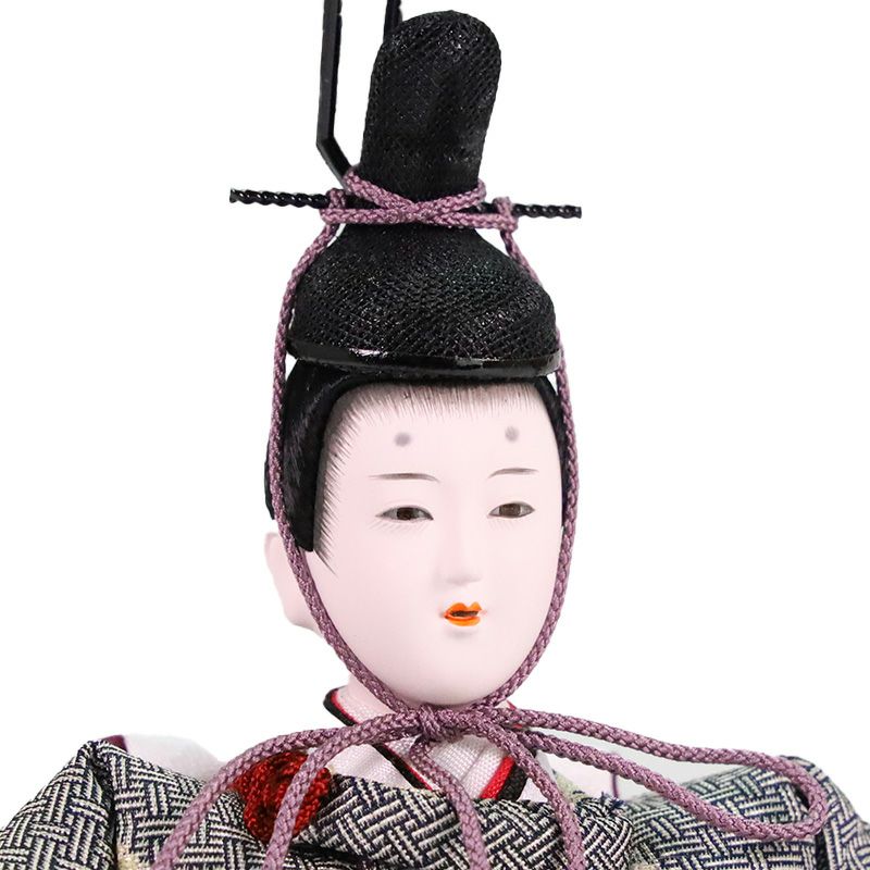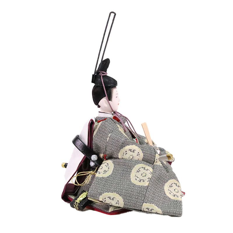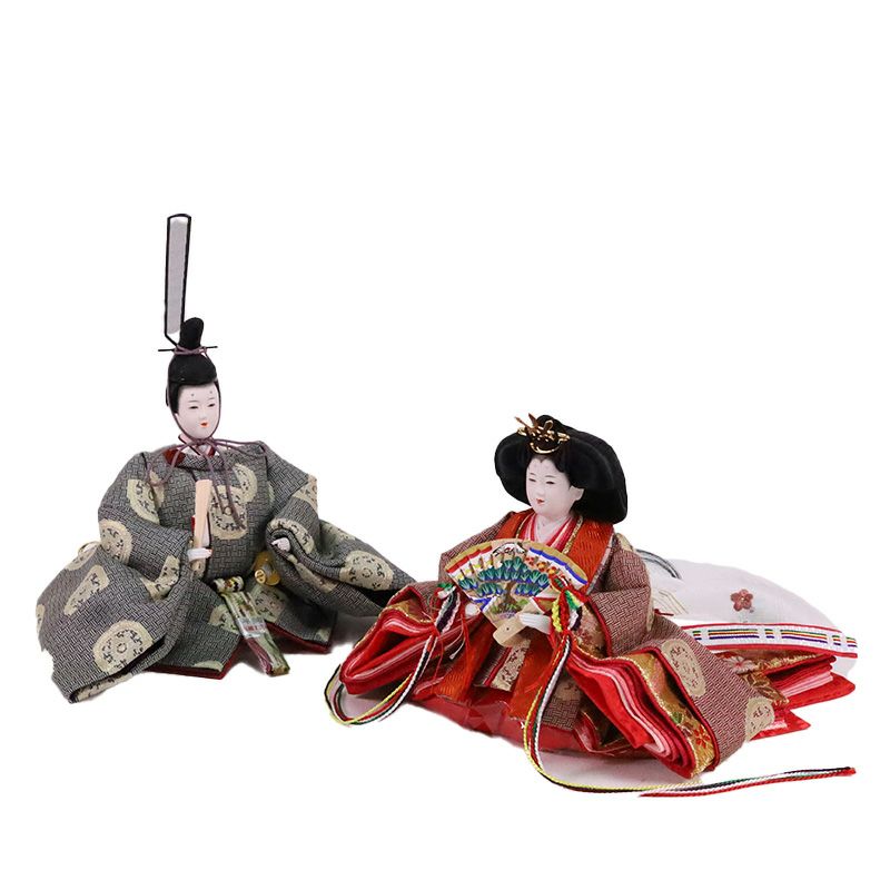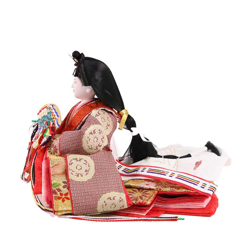 龍村美術織物・糸屋輪宝手グレーと同柄の朱赤の衣裳のおひなさま。落ち着きのある上品な収納タイプはすっきりとしたあきのこないデザインが魅力です。