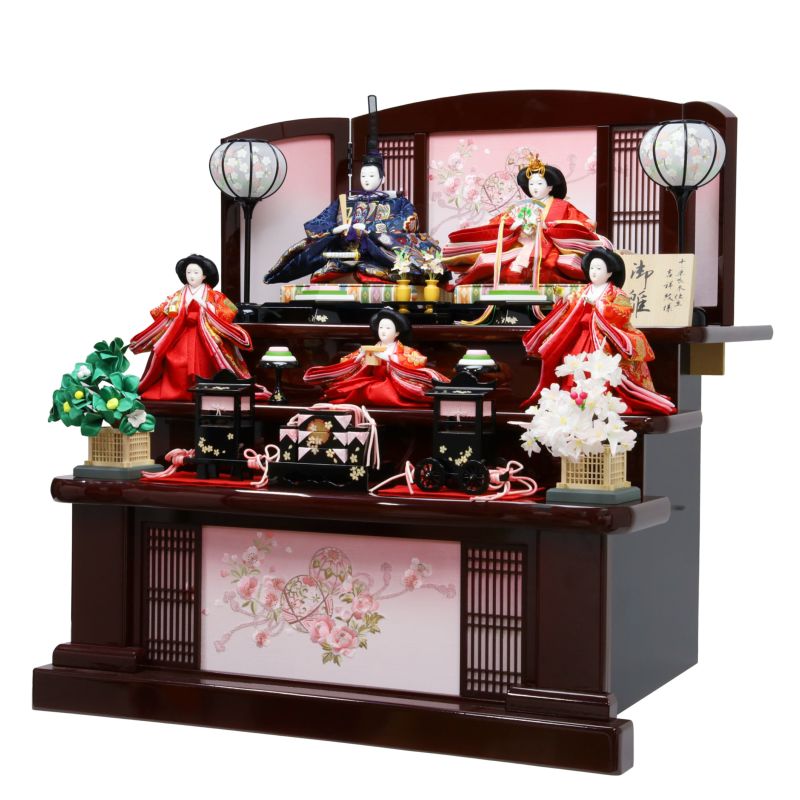 艶のある美しいお顔は、熟練の匠による手仕事。豊かな表情が品位を物語ります。伝統美のあふれる壇上に三人官女が賑わいを添える、珠玉の雛飾り。