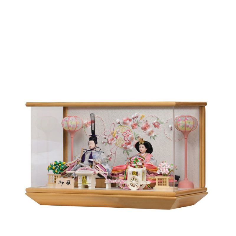明るい色合いをしたアクリルケース飾りです。お雛さまの淡い青色のお着物は、背景と同じ雪輪柄となっています。