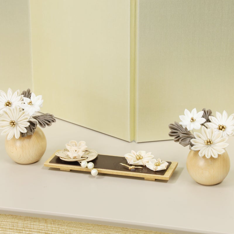 シンプルで奥行きのある佇まい。収納箱前面にあしらった花飾りが華やぎを添え、大人のセンスが光るひな祭りを演出します。