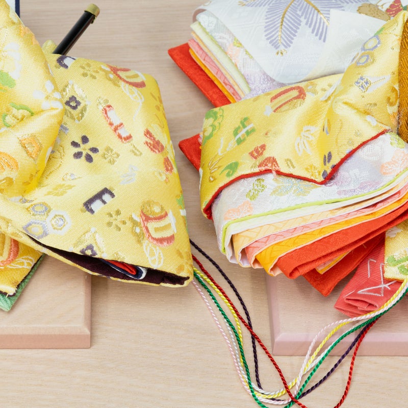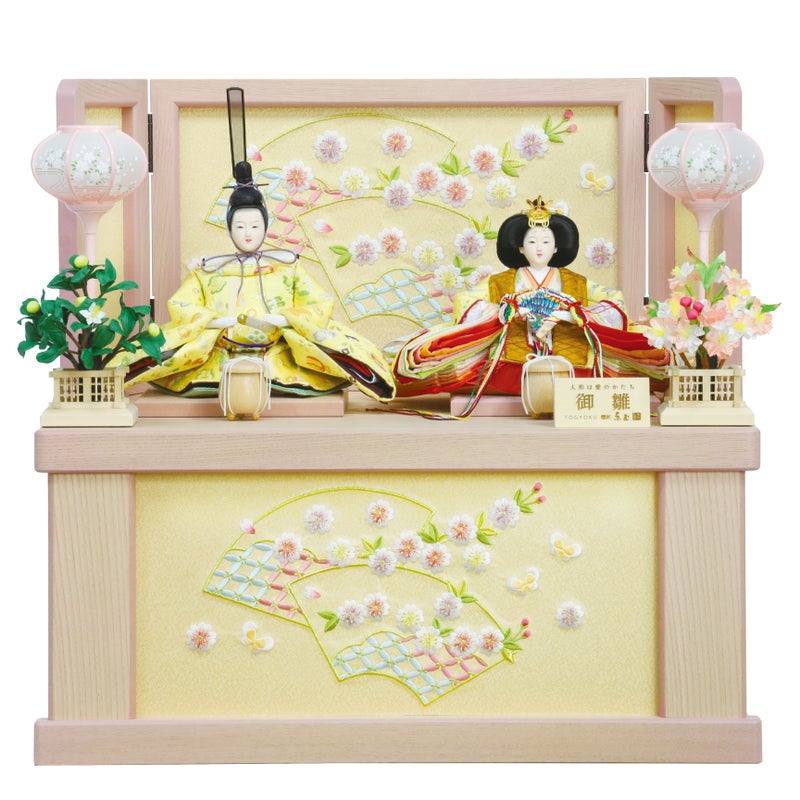 殿姫お揃いの衣裳は、幸運を運ぶ宝尽くしの吉祥文様。春色の収納箱にレモンイエローが映えて、ひな祭りの特別な日を明るく彩ります。