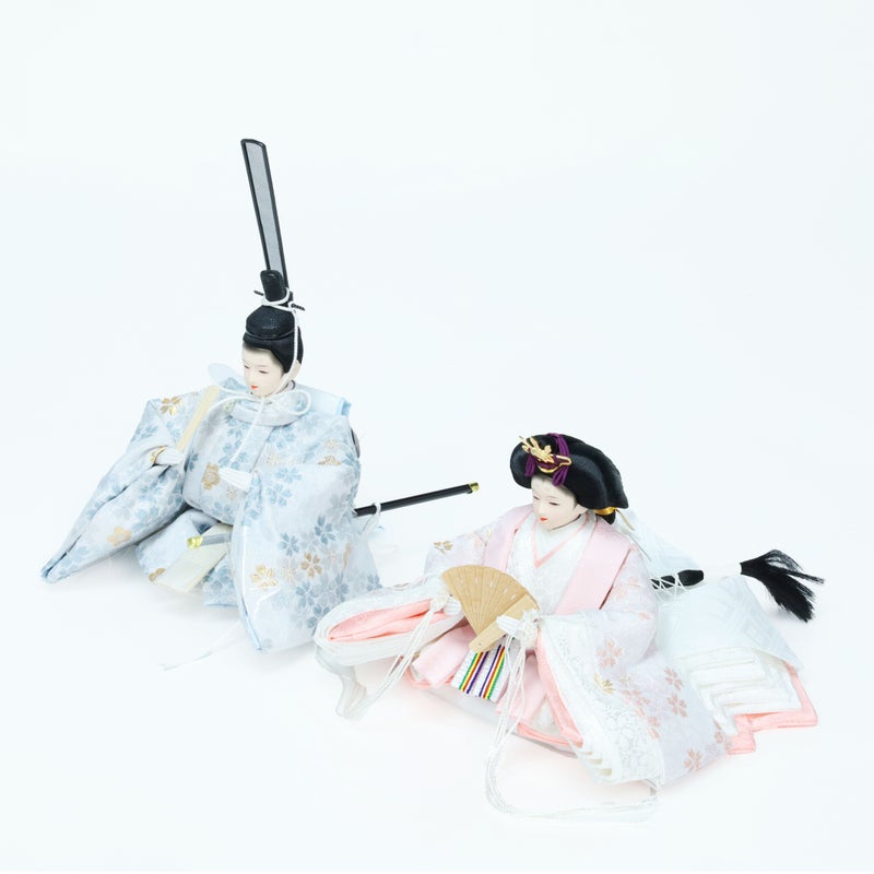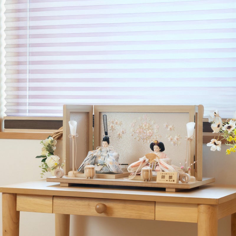 木目が美しいナチュラルな空間に座るひな人形は、水色と桜色の濃淡が優しく、ふんわりと柔らかな存在感。丁寧な手仕事で仕立てられています。
