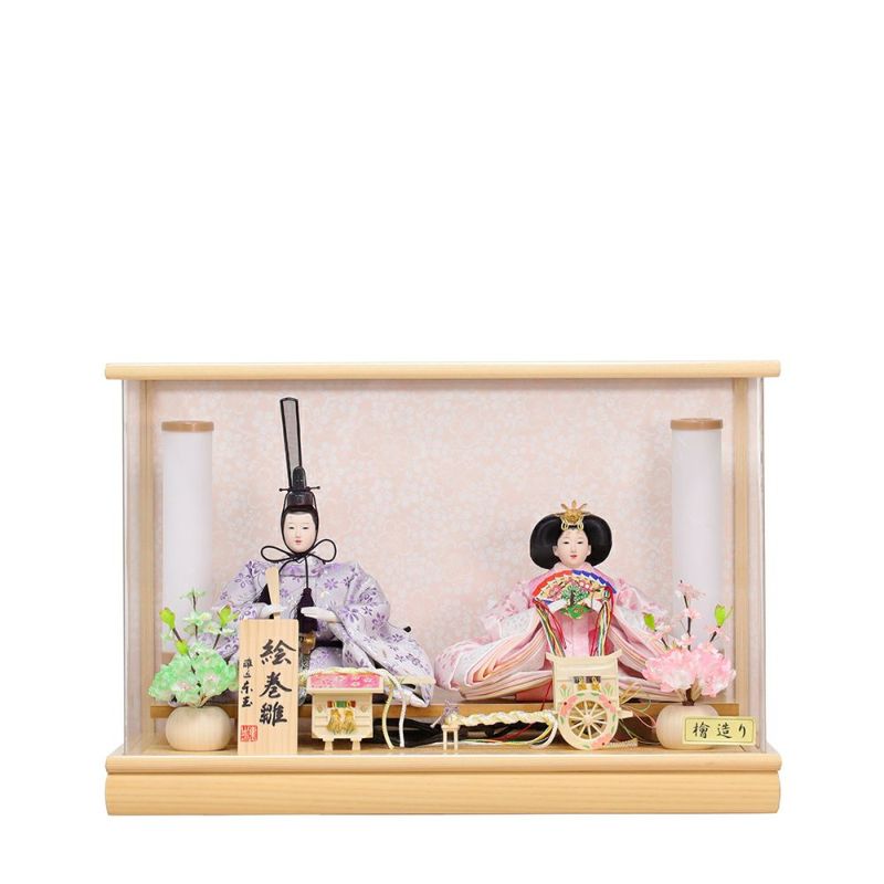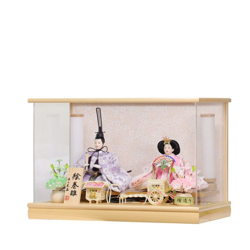 枠部分が木目のアクリルケース飾りです。お雛さまのお衣裳と、背景の柄は桜柄になっています。対の行灯がお雛さまを優しく照らします。