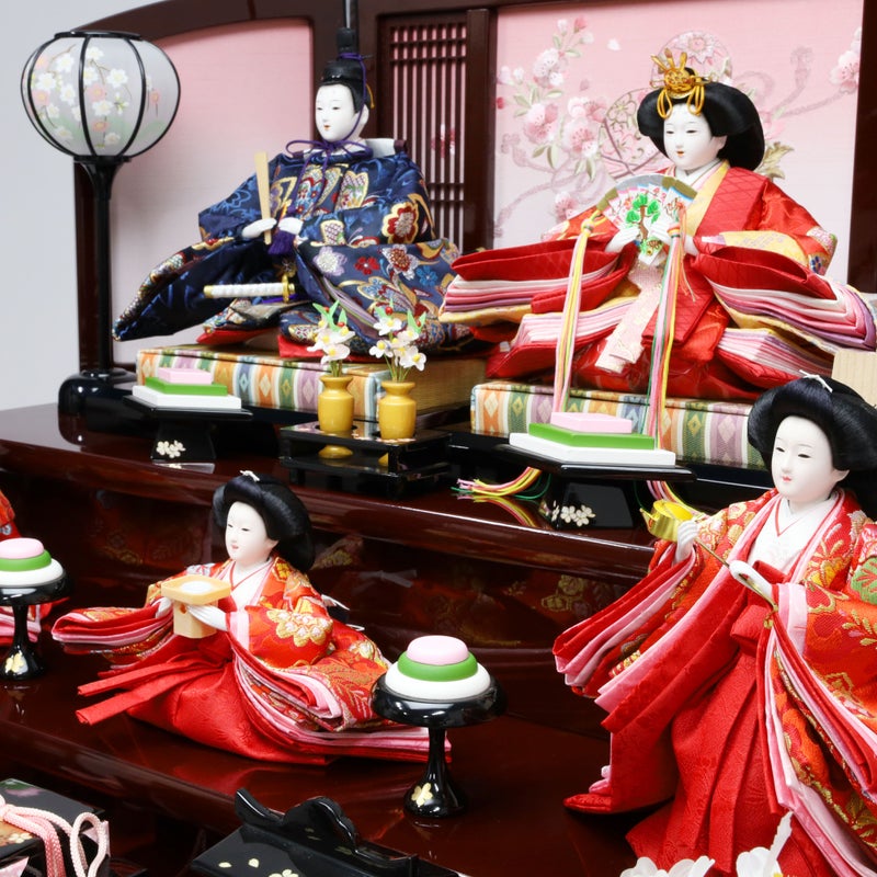 艶のある美しいお顔は、熟練の匠による手仕事。豊かな表情が品位を物語ります。伝統美のあふれる壇上に三人官女が賑わいを添える、珠玉の雛飾り。
