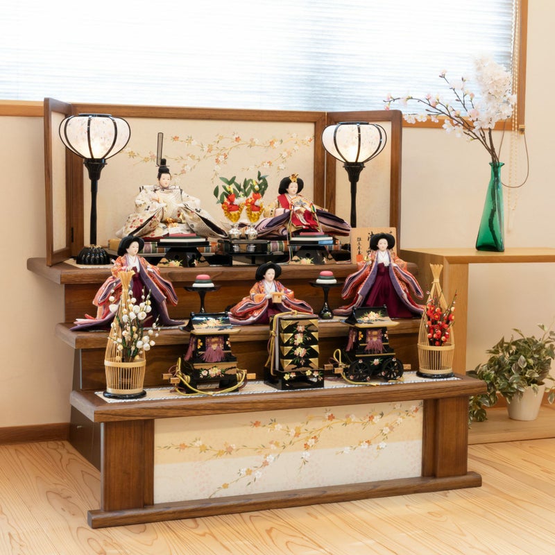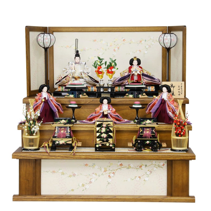 人形の襲ねに高貴な色とされた紫を配色し、優雅な風格の宿る三段飾り。組み合わせ方で段数が変わる1、2の3段は、自在な飾り方が可能です。
