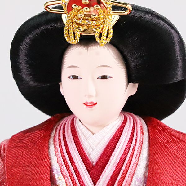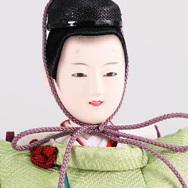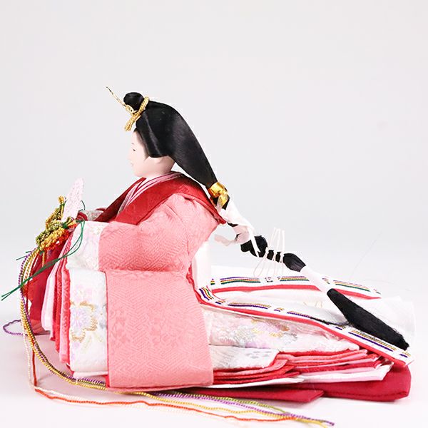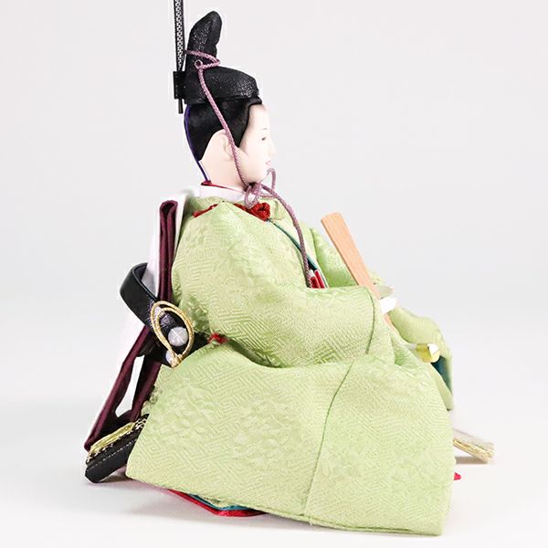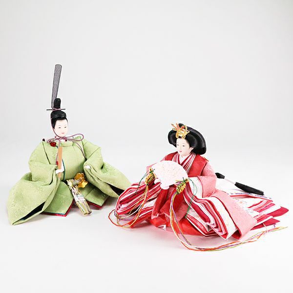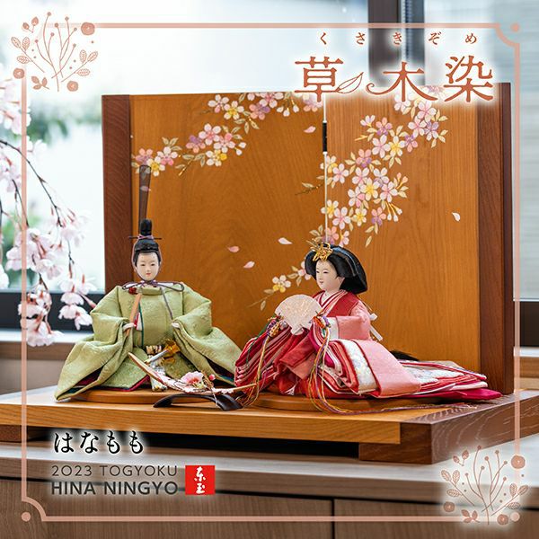 草木染の自然な風合いの衣裳を纏ったお雛様とコンパクトな木目調の飾り台は今どきのリビングにもよく合います。正絹の衣裳には小花の地模様入り。品と可愛らしさがあります。