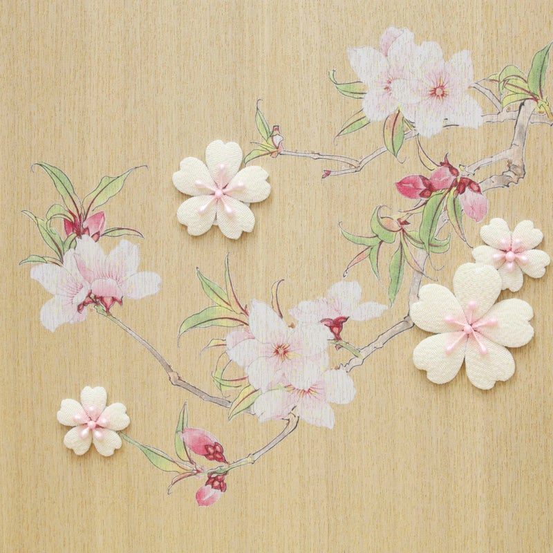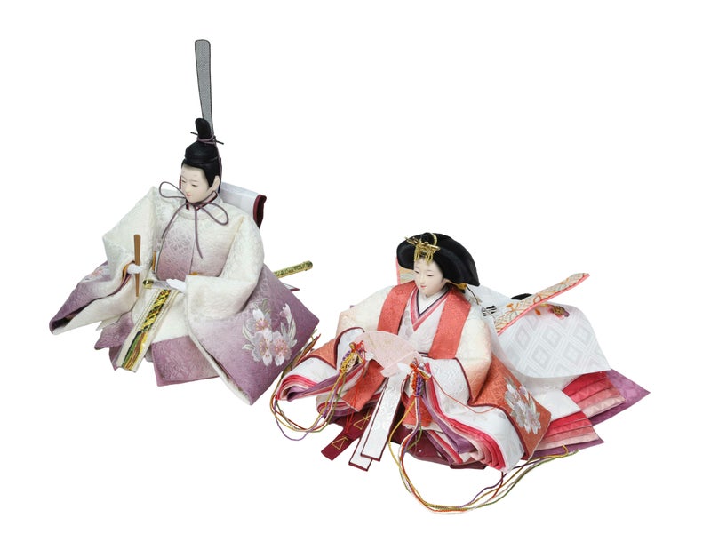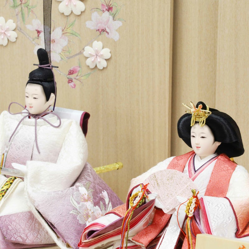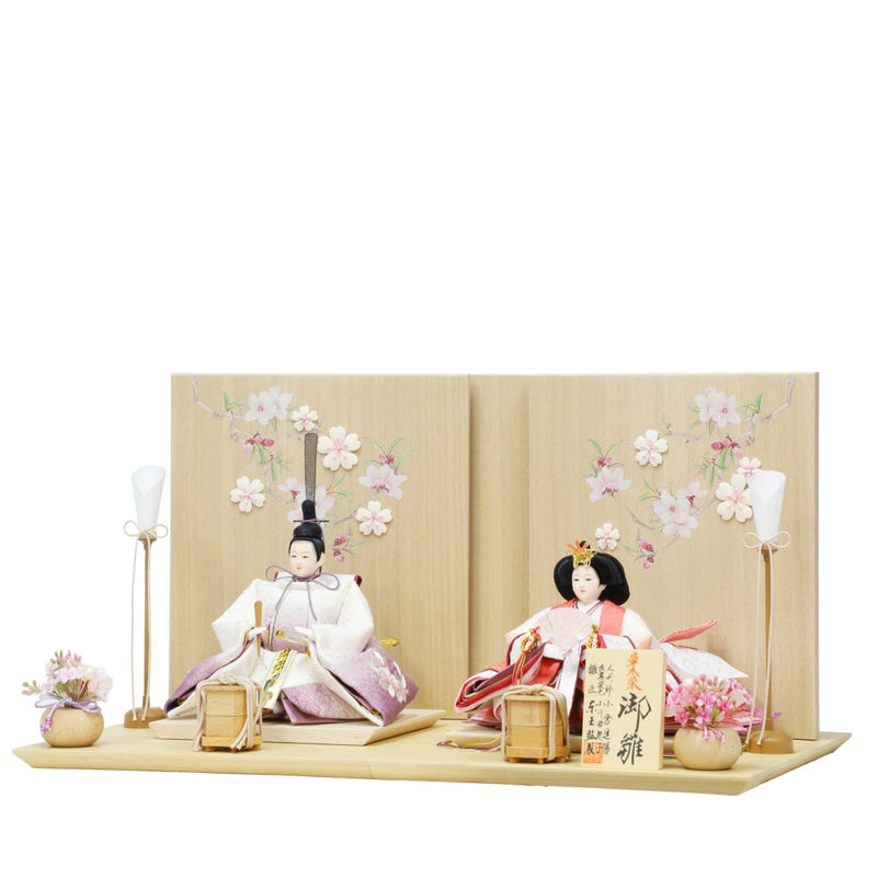 格調高い色を草木で染め上げた猩々緋の姫と古代紫の殿。木目の美しい屏風には押絵で描かれた枝桜がふっくらと花を開き、確かな日本の伝統技術に裏付けられた品格が漂うおひなさまです。