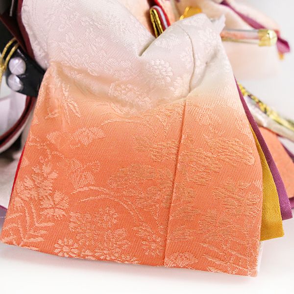草花の地模様が織り込まれた正絹の白布地を自然の恵みで染め上げた草木染のおひなさま。品のある優しい風合いに合わせ、屏風や台、前飾りを明るい白木調にまとめました。温かみのある色合いが人気のおひなさまです。