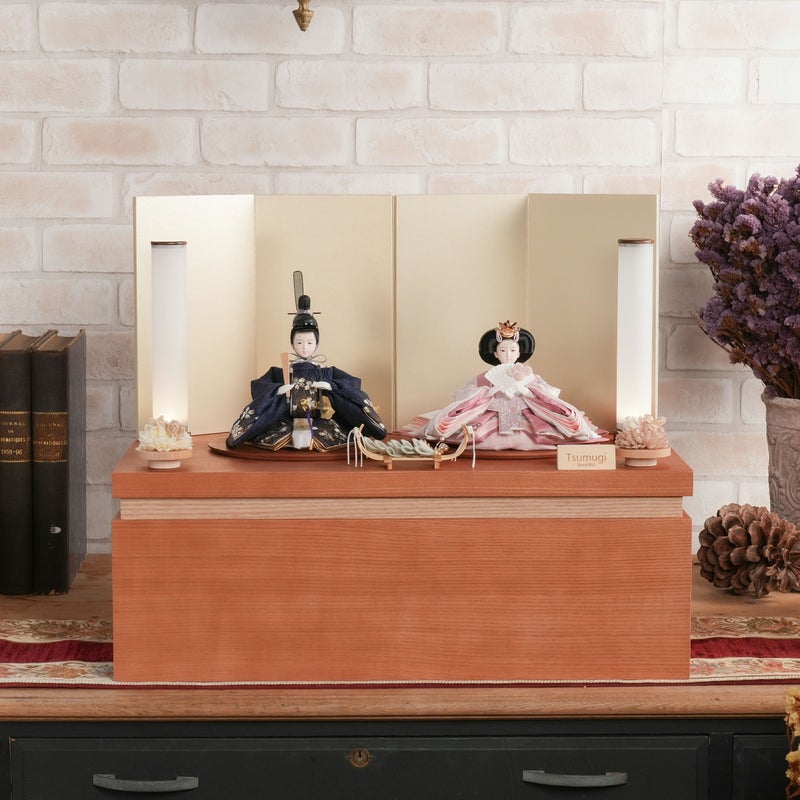 刺繍が施されたお殿様とあたたかい色合いのお姫様が、 華やぎを空間全体に広げます。 お道具の柔らかなトーンが お雛様にぬくもりを添える、収納タイプ「絢(あや)]。