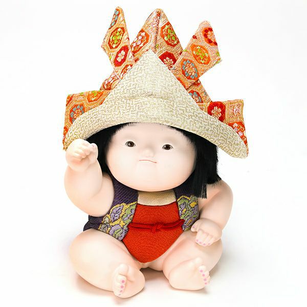 菖蒲のリース飾りの前で、ガッツポーズを決める可愛く凛々しい男児、皐月童「勇(ゆう)」。幼いけれど勇気凛々の勇君です。ナチュラル色の家具調飾台は、間口・奥行きともに23cmのコンパクトサイズ。飾るほどに愛着が増す五月人形です。