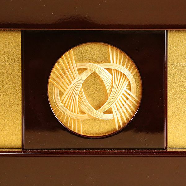 吹き返しには、龍の彫金を施しています。箱には、伝統的な駿河竹千筋細工を使用し、魅力のあるコンパクト収納飾りになっております。