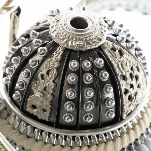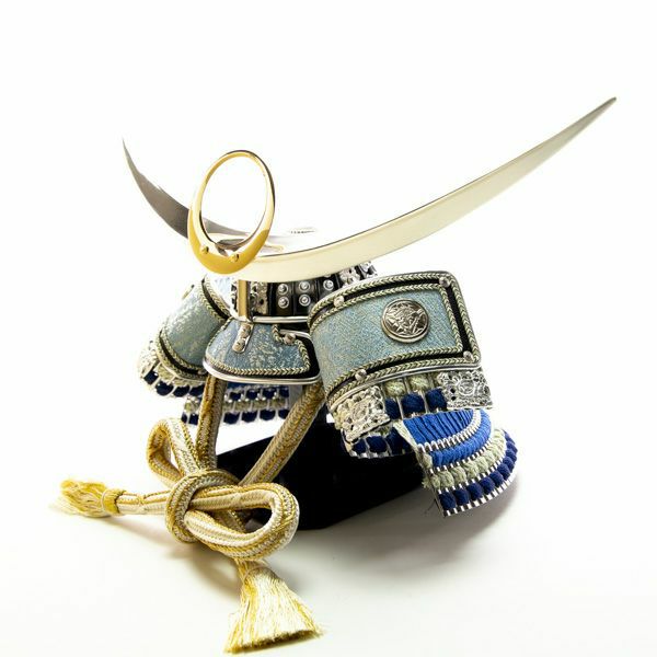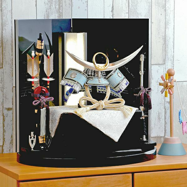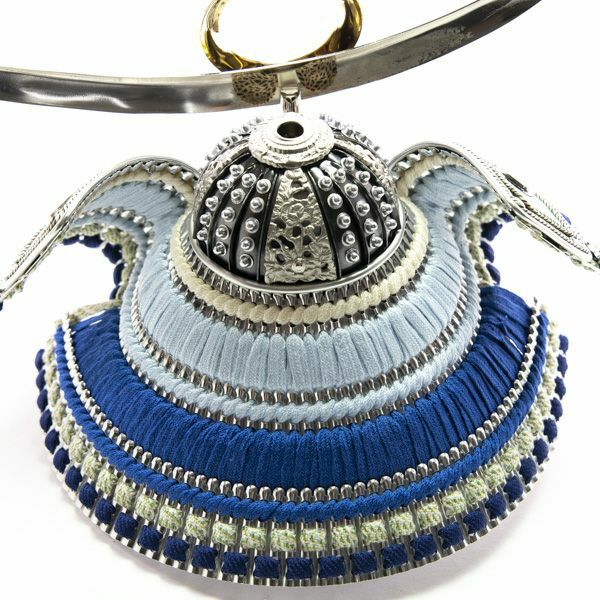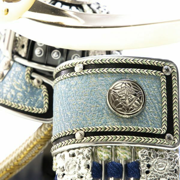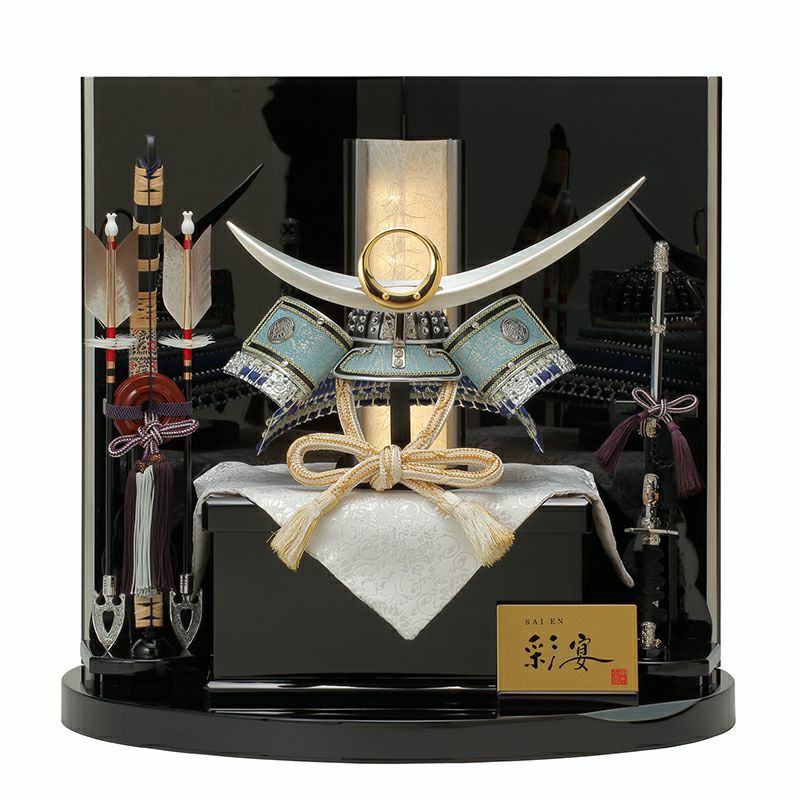 上杉謙信公を象徴する「日輪弦月前立」をあつらえた、シルバーを基調とした爽やかな青が特徴の兜。吹き返しに京都の龍村美術織物を使用しております。黒塗りの台屏風とLEDの優しい明かりが凛とした美しさを際立たせます。